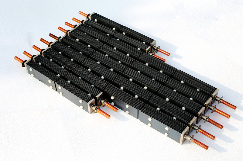 陽極材料可以選用涂層鈦電極?;旌涎趸锿繉逾侁枠O,使用壽命長,此種涂層鈦陽極的過電位也比較低,析氯電流效率高,節(jié)能效果好。